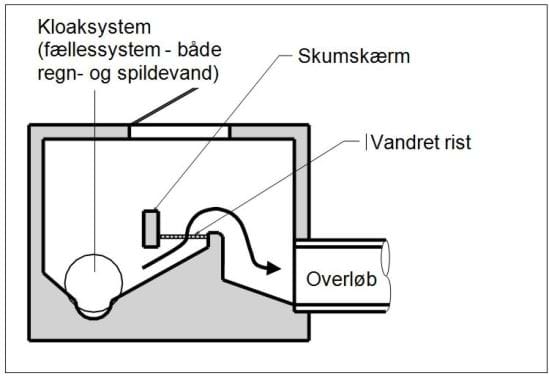 Eksempel på overløbsbygværk (snit). Funktion: Et overløbsbygværk regulerer vandmængden i kloaksystemet under regn blandt andet for at undgå oversvømmelser. Når kloaksystemet er fyldt (typisk ved større regnhændelser) løber den overskydende spildevandsmængde således urenset gennem risten og ud i recipienten.