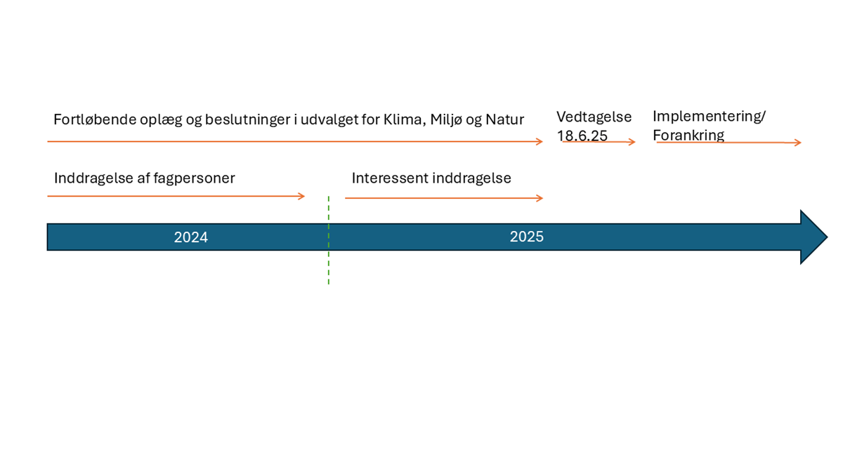 Undervejs har udvalget for Klima, Miljø og Natur været involveret i processen. Udvalget har den 3. marts 2025 vedtaget delmålene for strategien. Strategi og delmål blev præsenteret for Kommunalbestyrelsen til et opfølgningsmøde onsdag d. 26. marts. Dette gav anledning til at lave en mindre revision af delmålene og de reviderede delmål blev sendt til vedtagelse i udvalget for Klima, Miljø og Natur den 5. maj 2025. Den samlede strategi blev besluttet i juni 2025.