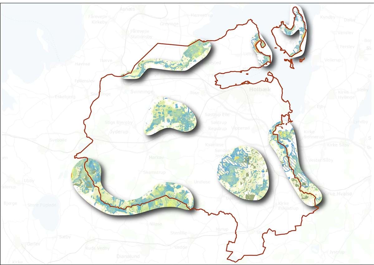 Med afsæt i en overlapsanalyse af ovenstående kortgrundlag og lokal viden om de konkrete områder, er der syv områder i Holbæk Kommune, der særligt har potentiale for at etablere store sammenhængende naturområder i fremtiden. De syv områder fremgår af nedenstående kort. Markeringen på kortet er udelukkende lavet for at indikerer områderne overordnet. De er ikke eksakte.