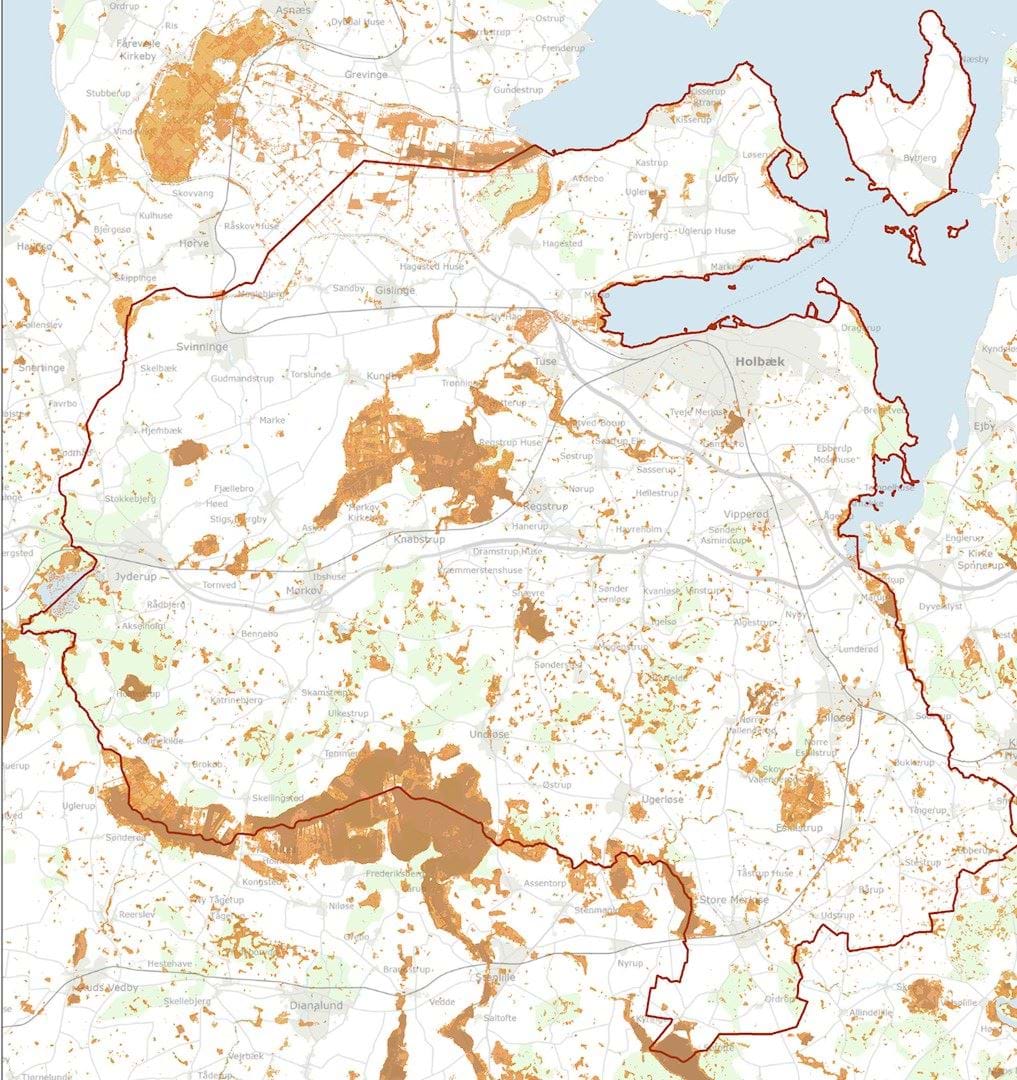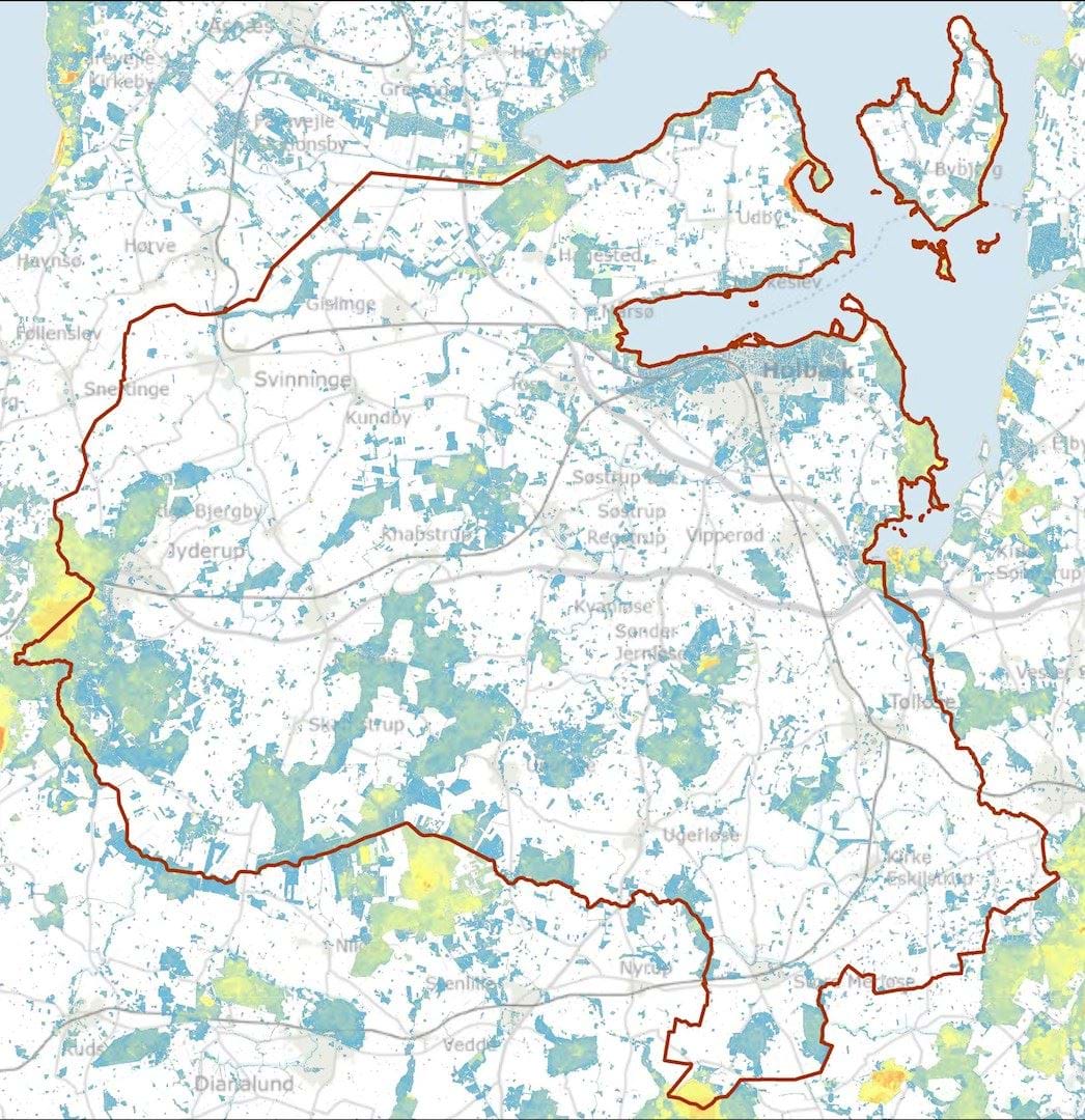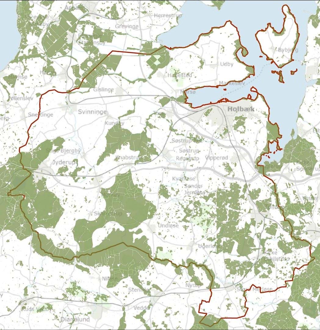 For at nå målene for biodiversiteten i Holbæk kommune er vi afhængige af at skabe de store sammenhængende naturområder. Som en del af strategien, er der derfor blevet udarbejdet en overlapsanalyse af allerede eksisterende kort og data. Formålet var at udpege potentielle områder for stor sammenhængende natur. Stor sammenhængende natur er arealer, der overstiger 500 hektar og hvor naturen ved hjælp af græssende dyr får lov til at udvikle sig. Hvilken slags natur, der udvikler sig, afhænger af den natur og det landskab der i forvejen er, i det konkrete område. I disse områder skal der både arbejdes med at gøre den eksisterende natur bedre og der skal også etableres ny natur. Arbejdet med at finde de områder, der har størst potentiale til store naturområder i Holbæk kommune er foretaget med afsæt i flere kortgrundlag, som vises herunder.