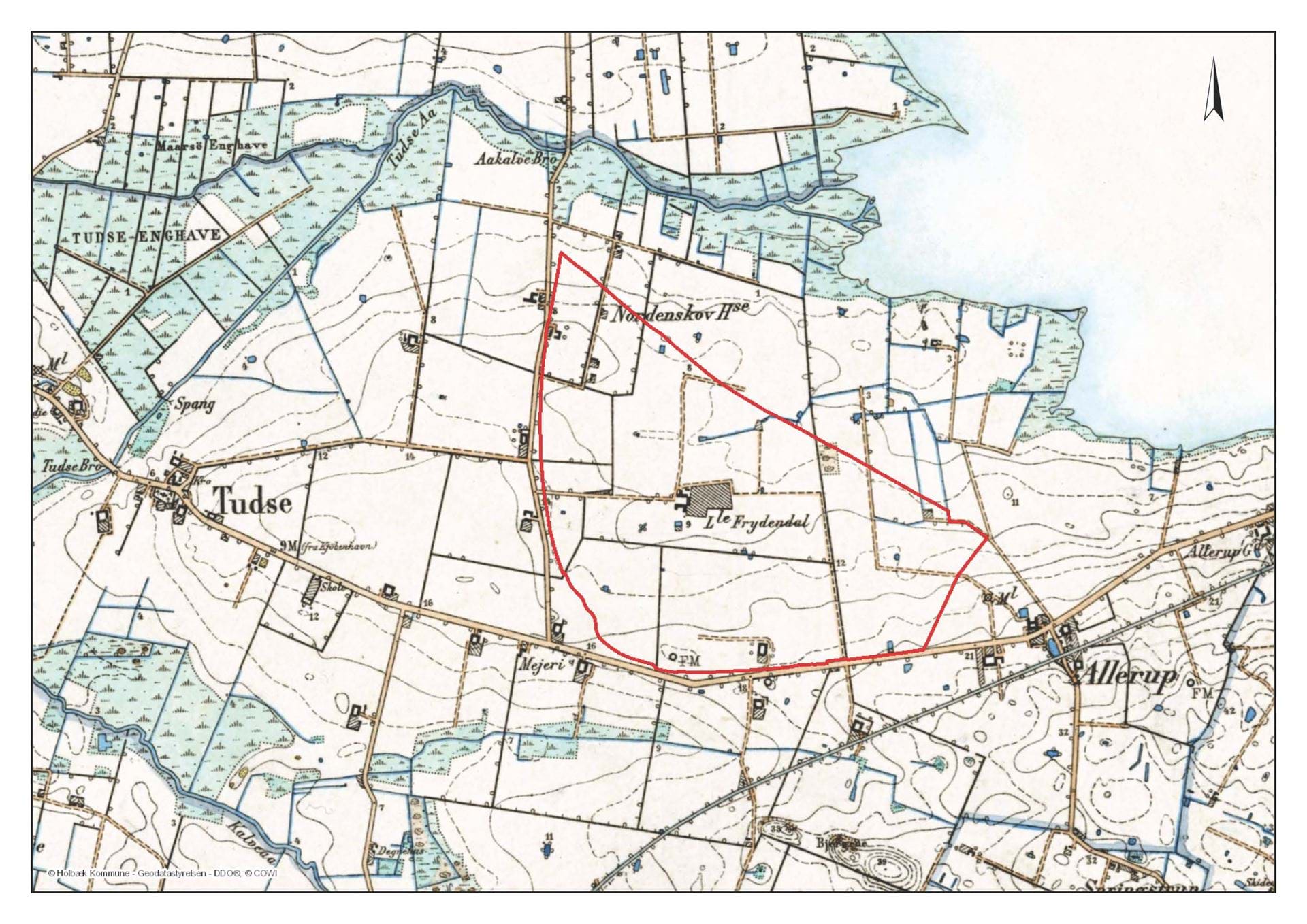 Kortet viser området i perioden 1842-1899 i tiden efter landboreformerne hvor mange gårde er flyttet ud fra Tuse og Allerup landsbyer, og ligger koncentreret langs vejene. Jorden i projektområdet har oprindeligt været en del af Allerup og Tuse landsbyejerlav. Man kan hurtigt genkende linjerne i området, der viser de sten- og jorddiger, som stadig ses i området i dag, og hvoraf flere er udpeget som beskyttede diger. Lille Frydendal, der ligger centralt i området, er en større gård bygget på den jord der på de gamle matrikelkort kaldtes 'Lundegårdens marker'. Gården har været velhavende, hvilket antal og størrelse på driftslængerne, stuehusets frontispice og indgangsparti, samt navnet, fortæller. Men den er ikke stor nok til at have været en hovedgård med gods. Måske har det været en såkaldt proprietærgård. Her var ejeren ikke en del af bondestanden, men havde tjent en formue på anden vis, ofte købmandskab, og som gerne ville nyde livet som jordejer, ligesom de fornemme godsejere.