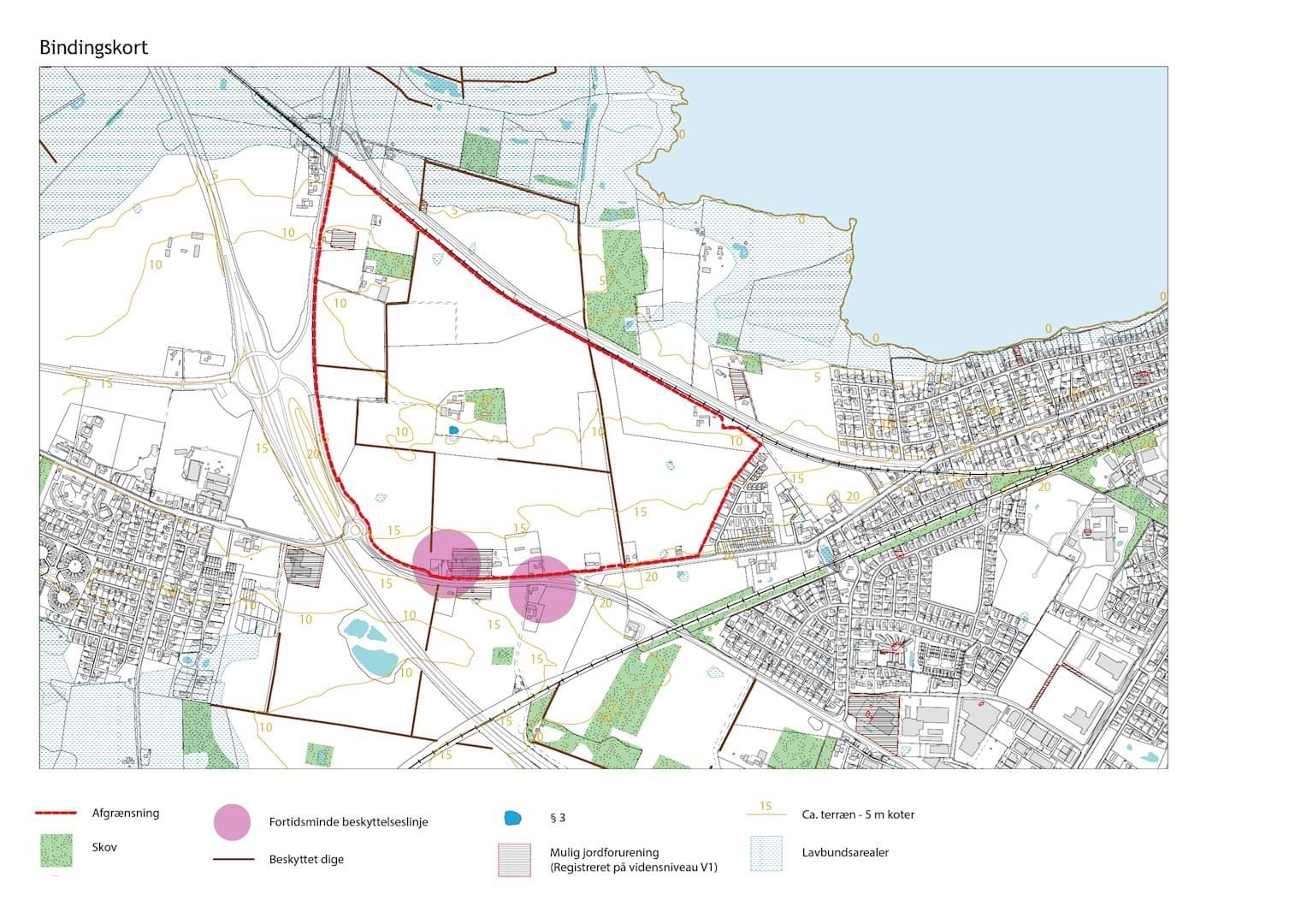 Kortet viser de forskellige bindinger og naturinteresser, som er udpeget på arealet. Det er især digerne og de grønne hegn, der præger området. Der er udpeget et enkelt §3 vådområde og to mindre områder med skovkarakter. Mod syd ved Kalundborgvej ligger to fortidsminder, som kaster en beskyttelseslinje ind på arealet. Hele arealet ligger indenfor Kystnærhedszonen.