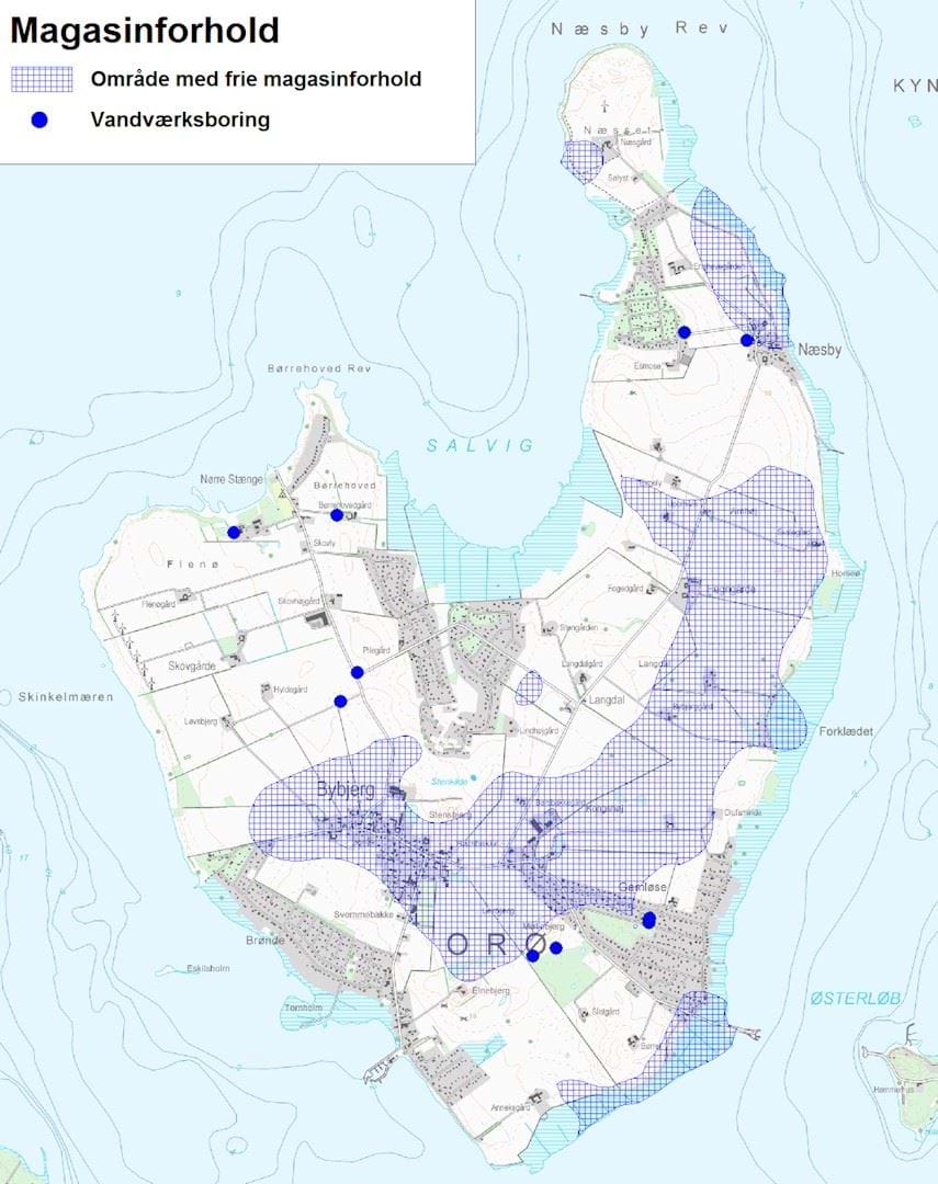 På Orø ligger det primære grundvandsmagasin 20-30 m under terrænoverfladen. Det er fra det primære grundvandsmagasin, vandværkernes indvinding af drikkevand foregår. Der findes grundvandsmagasiner tættere på terræn – de sekundære grundvandsmagasiner - men de har ofte kun lokal udbredelse og anvendes mest til forsyning af enkeltejendomme uden for vandværkernes forsyningsnet.