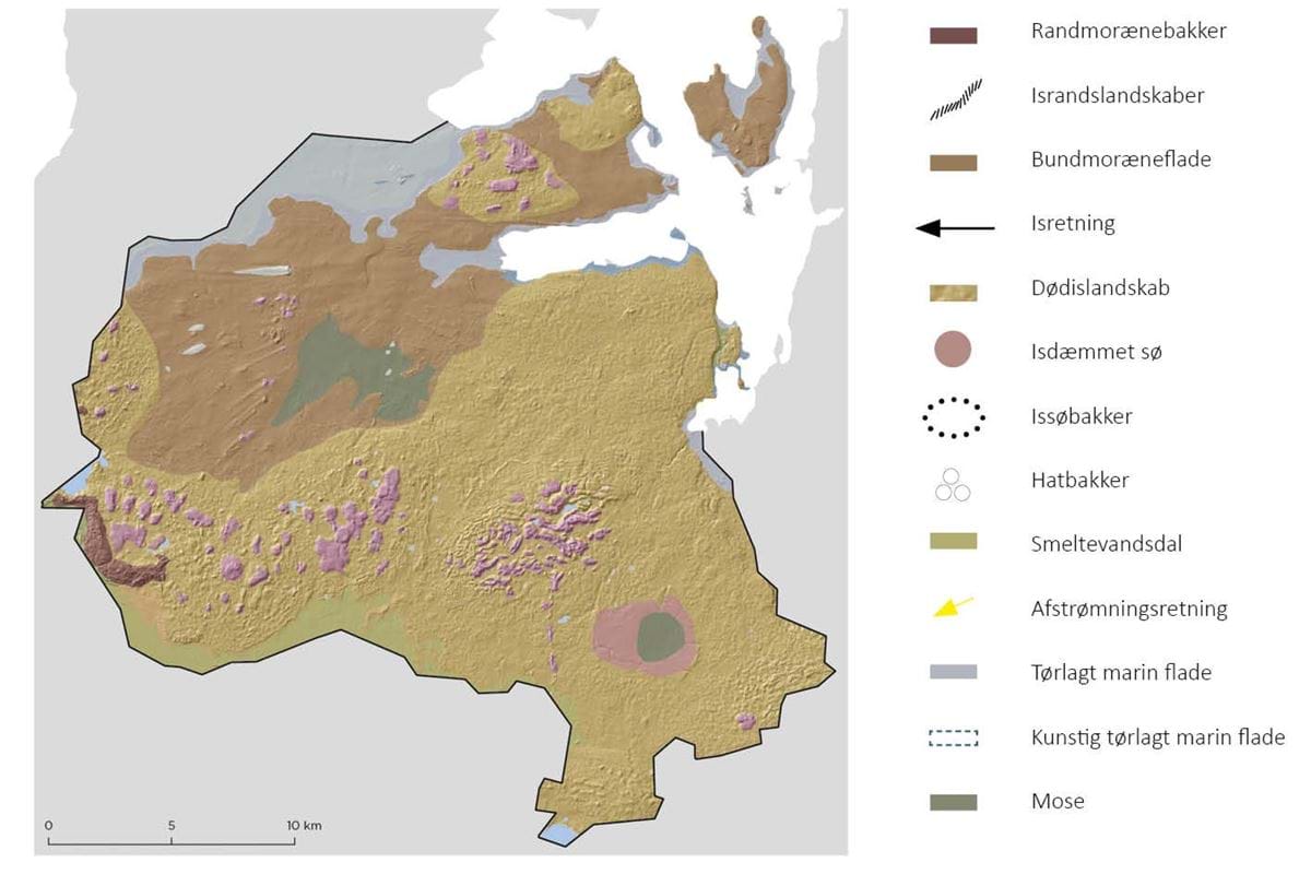 Store dele af landskabet har været dækket af is. Da isen stoppede med at bevæge sig og begyndte at smelte blev det materiale isenindeholdt aflejret som bakker. De steder hvor dødisblokke lå tilbage og smeltede efterladte de sig huller i landskabet. tilsammen gav det et mere eller mindre bakket og bølget terræn ofte med mange småsøer som det ses i store dele af kommunens landskab.