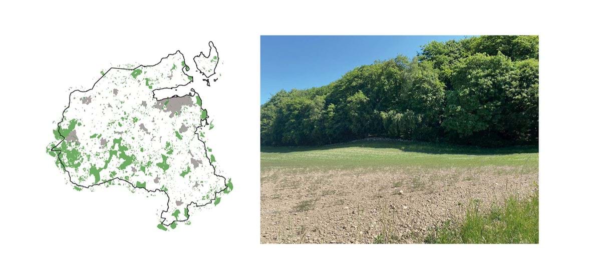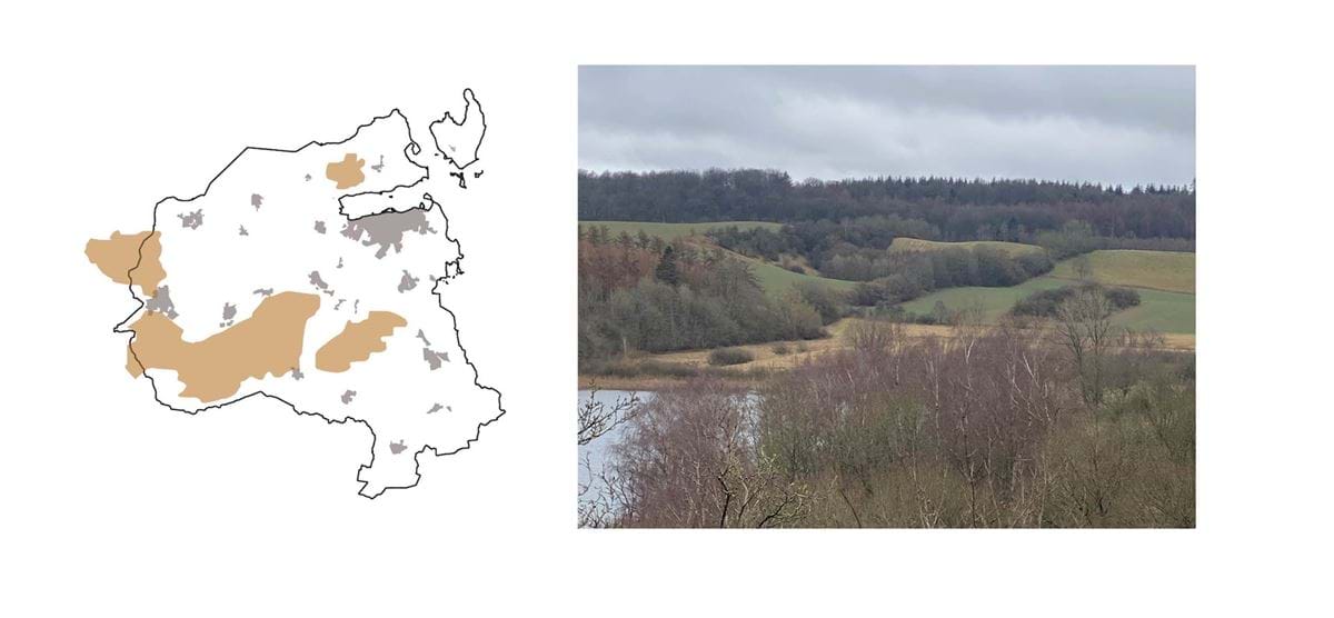 Skov- og bakkelandet er en mosaik af landskabsrum, der er dannet af terrænet og bevoksninger. Her ligger bebyggelsen som enkeltejendomme eller i mindre enheder i terrænet.