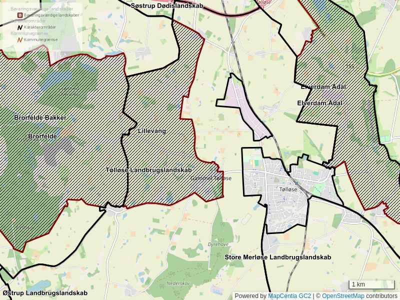 Området vest for Gammel Tølløse og mod Nyby i nord er udpeget til bevaringsværdigt landskab. De bærende elementer i området, er den visuelle sammenhæng mellem det kuperede bakkelandskab ved Brorfelde og det lavereliggende bølgede landskab i Tølløse. Området byder således på imponerende udsigter mod Brorfeldes bakker med en tydelig oplevelse af de forskellige landskabers kontrast.